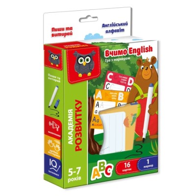 Гра настільна «Пиши та витирай. Англійський алфавіт» з 16 крток, губки та маркера, у коробці 14,5х3х21,5 см, ТМ Vladi Toys