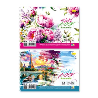 Скетчбук «Акварельний» А4 на 20 аркушів на пружині з ламінованою обкладинкою, в асортименті, ТМ Апельсин
