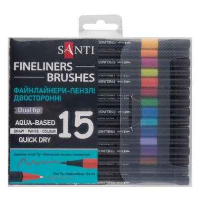 Набір файнлайнерів-пензлів на 15 кольорів двосторонніх, ТМ SANTI