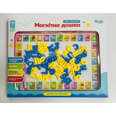 Дошка магнітна двостороння: український алфавіт, цифри, крейда, маркер, губка для дошки, у коробці 42,5х34х2,5 см