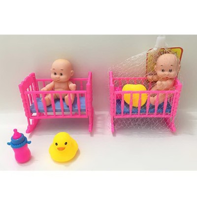 Пупс 11 см з ліжечком 12,5х10х8,5 см, качечкою-пискавкою 6 см та пляшечкою, у сітці 12,5х22х8,5 см