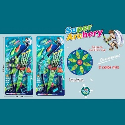 Набір зброї: лук 30 см з 4 стрілами, мішень, 3 кеглі, пістолет, 10 кульок та 3 снаряди на присосках, в асортименті, у коробці 29,7х63,3 см