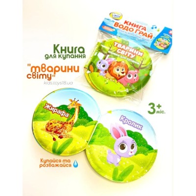 Книжка для купання «Тварини світу» 13х13,5х2 см зі звуком та назвами тварин українською, у пакеті 16,5х21х2 см