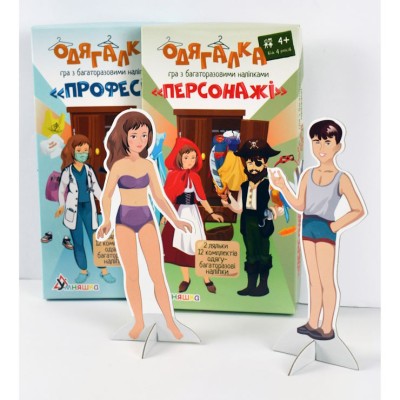 Гра навчальна «Одягалка.Персонажі»: 2 ляльки 18 см та 12 багаторазових наліпок, у коробці 23х12,5х2,5 см, ТМ Умняшка