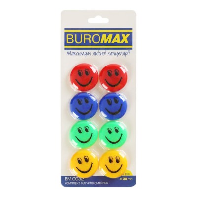 Комплект магнітів «Смайлик» коьорові 8 шт х 30 мм, ТМ Buromax
