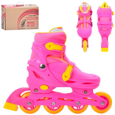 Ролики 35-38 розміру розсувні з колесами ПУ 70 мм зі світлом, пряжкою, на пластиковій рамі, рожеві, у коробці 37х27,5х11 см