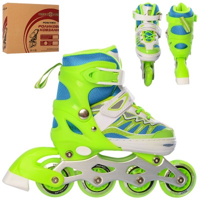 Ролики розміром 31-34 розсувні, шнурівка+пряжка, алюмінієва рама, колеса ПУ 64 мм зі світлом, зелені, у коробці 35х27,5х10,5 см.