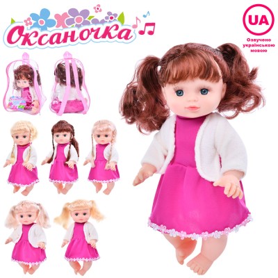 Лялька «Оксаночка» 33 см музична з українською озвучкою: співає пісню, рахує, розповідає вірші, на батарейці, в рюкзаку 21х28х14 см
