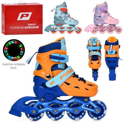 Ролики 31-34 розміру розсувні зі шнурівкою та пряжккою на алюмінієвій рамі, колесами ПУ 64 мм зі світлом, в асортименті, у коробці