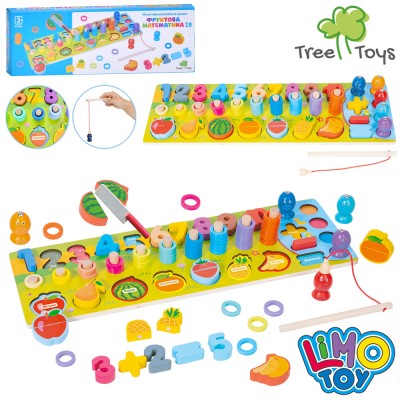 Багатофункціональна дошка «Фруктова математика» дерев`яна: ігрове поле 44,5х15 см, цифри від 1до10, математичні знаки, різнокольорові кільця, фрукти-пазли, у коробці 46х16х5 см