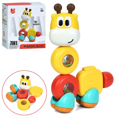 Брязкальце «Жираф» 27 см 7в1: конструктор, пищалка, прорізувач та текстурні деталі, у коробці 16,5х19х7,5 см