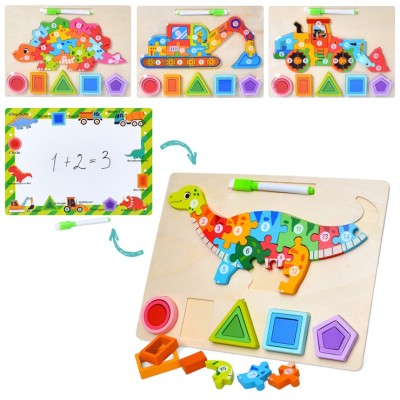 Пазли дерев'яні 2 в 1 на 15 елементів з ігровим полем 30x22,5 см, дошкою для малювання маркером, геометричними фігурами, маркером, в асортименті