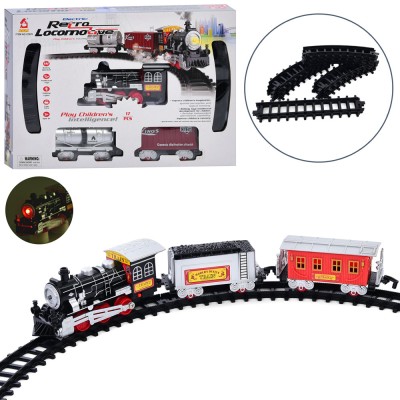 Залізниця 88-66 см зі звуком та світлом з 17 деталей: локомотив, 2 вагони, на батарейці, в асортименті, у коробці 40,5х26х5,5 см.