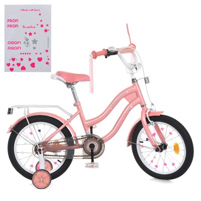 Велосипед «PROF1 STAR» 2-колісний на металевій рамі з колесами 16 дюймів, дзвіночком, ліхтариком, багажником та додатковими колесами, рожевий