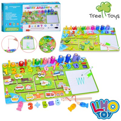 Бізідошка «Шлях додому» дерев`яна: ігрове поле 45х23 см, лабіринт, магнітна риболовля, дошка для малювання, кільця, маркет, 2 види транспорту, у коробці 46х23х4 см