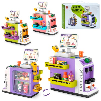 Дитячий супермаркет з 46 елементів зі світлом та звуком: прилавок, каса, сканер, кавоварка з водою, продукти, гроші, на батарейці, в асортименті, у коробці 41х25,5х13 см.