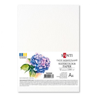Набір акварельного паперу А4 з 12 аркушів 200 г/м2 середнє зерно, у пакеті, ТМ SANTI
