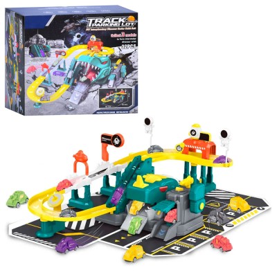 Гараж «Динозавр» 60,3х39,1х21 см 2-поверховий на 32 елементи з 5 машинками, на батарейці, у коробці 30х27,5х16,5 см