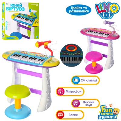Синтезатор 49х25х43,5 см зі стільцем, мікрофоном, музикою, світлом та регулятором гучності, на батарейках, в асортименті, у коробці 49х48х11 см