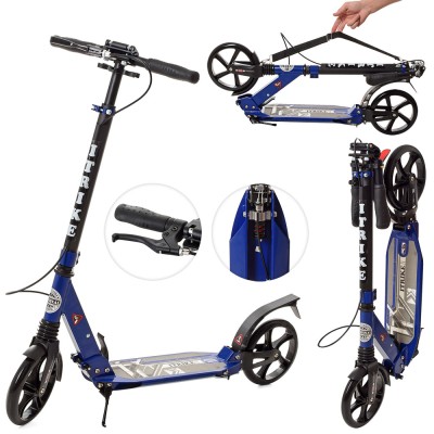 Самокат 2-колісний на металевій рамі, колеса з ПУ 200 мм та ручним гальмом, синій, у коробці