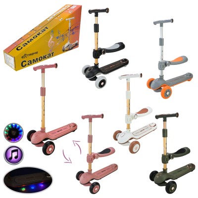 Самокат 3-колісний, 2 колеса PU зі світлом, заднє пластикове, складаний з сидінням, в асортименті, у коробці