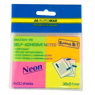Блок паперу клеєний 38х51 мм 200 аркушів, неон, в асортименті, ТМ Buromax