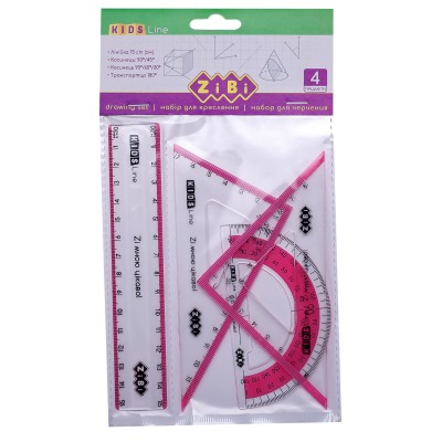 Набір: лінійка 15 см, 2 косинця, транспортир, з рожевою смужкою, ТМ ZiBi